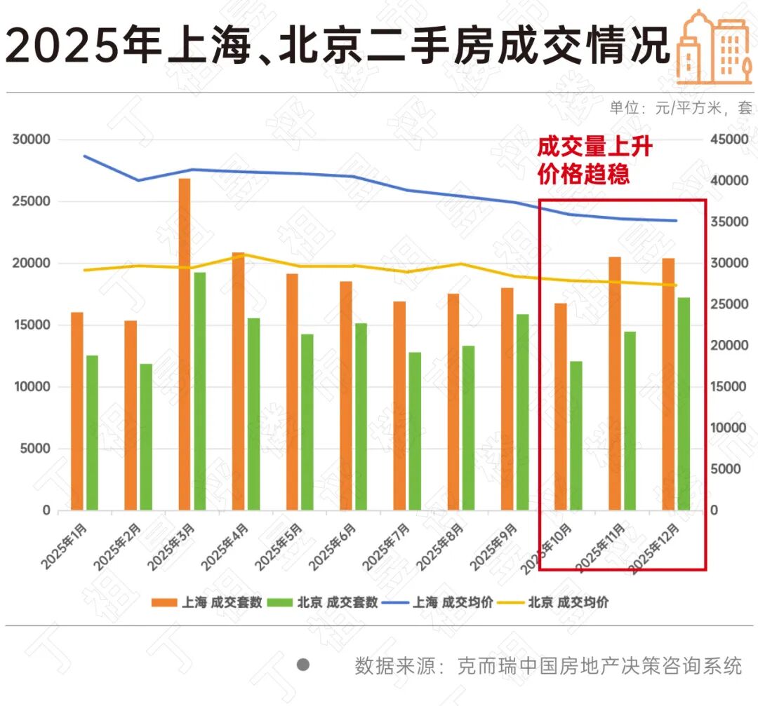 2025年至今,北京和上海的二手房市场一直相对坚挺。2025年11月及12月也都出现了“翘尾”行情,成交面积都在10月筑底后出现了回升。