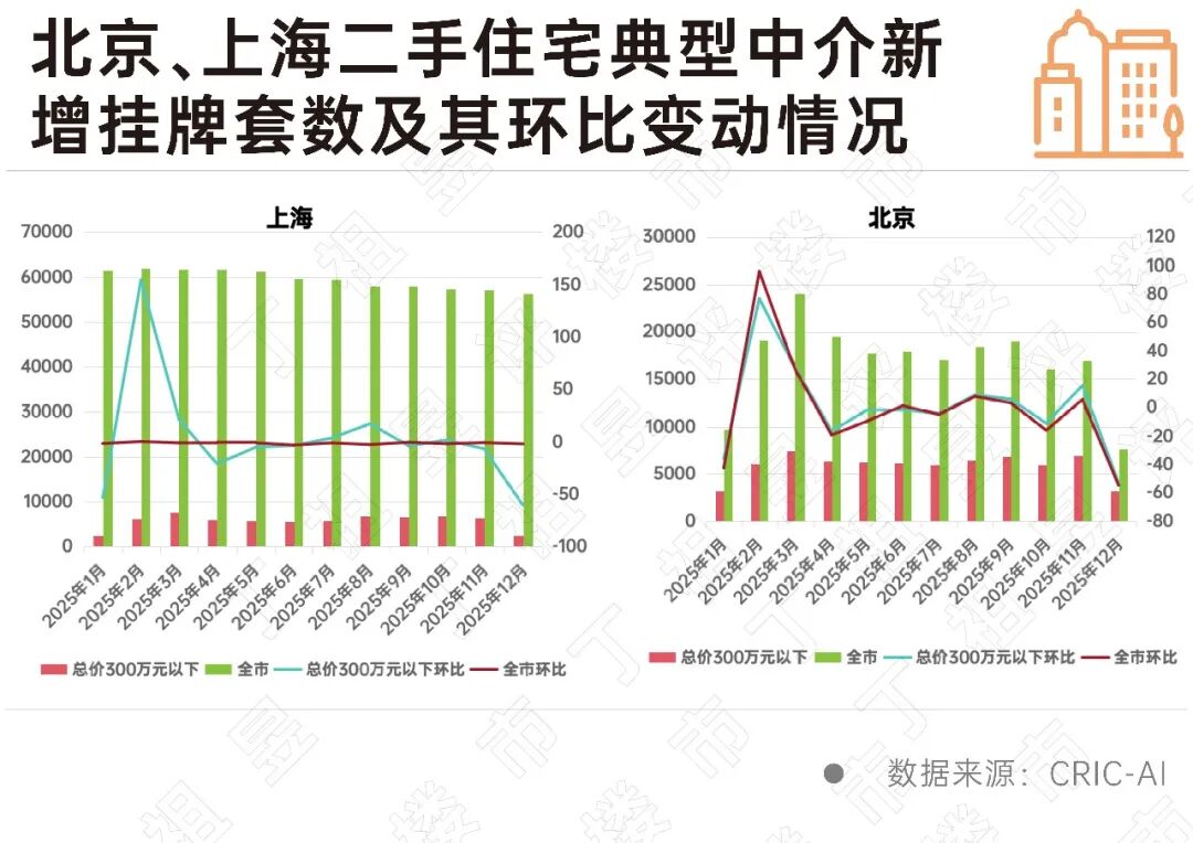 数据显示,上海二手住宅月度典型中介新增挂牌套数自2025年5月起明显下滑,其中,总价300万以下的挂牌量下滑幅度明显高于全市二手房挂牌量。北京也呈现出同样的趋势,总价300万元以下房源挂牌量降幅大于全市二手房挂牌量。