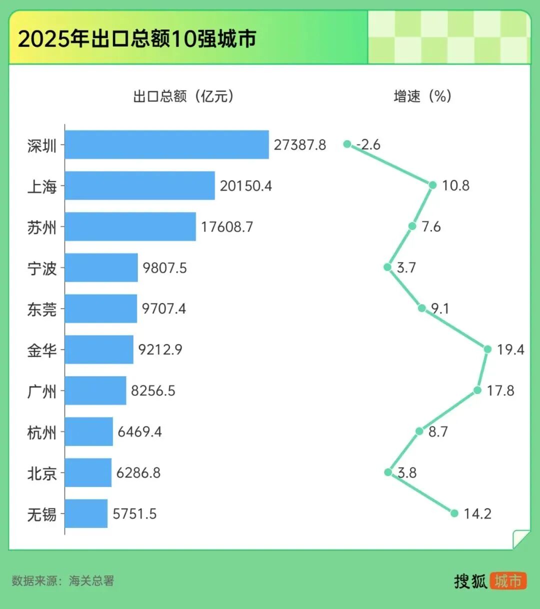 出口方面,宁波2025年出口9807.5亿元,增速仅为3.7%,在出口十强城市中位居倒数第二,仅比深圳的负增长略好。