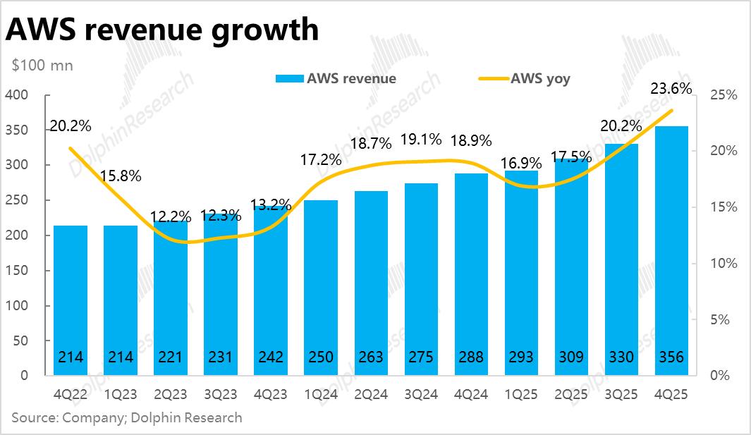当前压倒一切、“决定生死”的单一指标——AWS本季营收同比增长23.6%到$356亿(恒定汇率下增速类似),相比上季再度提速3.4pct,相比年初增速已累计拉升6.7pct。可以说如期交付了市场期待良久的AWS再提速。