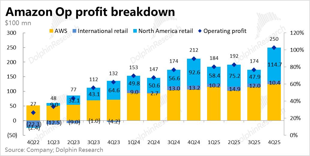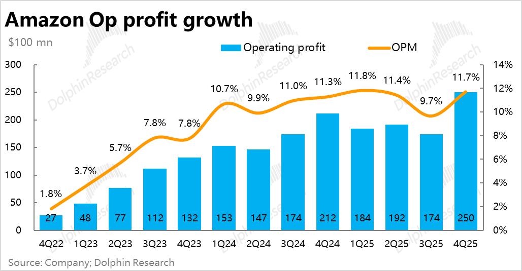 利润表现也不错,整体经营利润$250亿,同比增长近18%,同样小幅跑赢市场预期。整体经营利润率11.7%,虽有高额Capex、利润率仍逆势同比扩张了0.4pct。