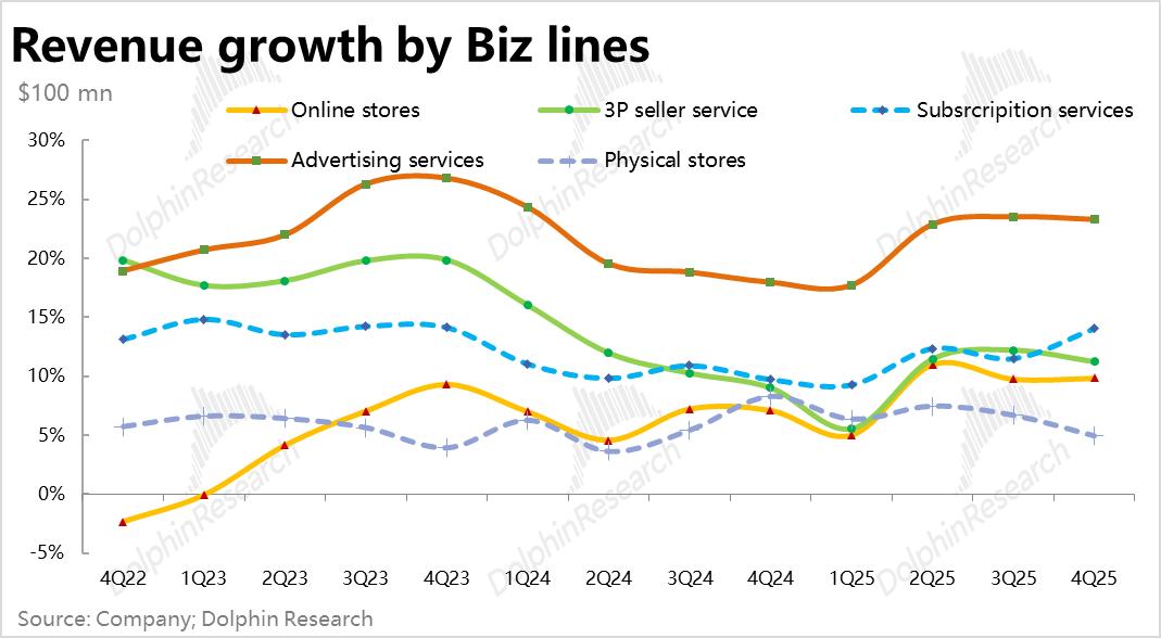 4、广告业务继续强劲增长:泛零售的细分业务线中,广告业务和订阅业务是本季比较亮眼的两个板块。