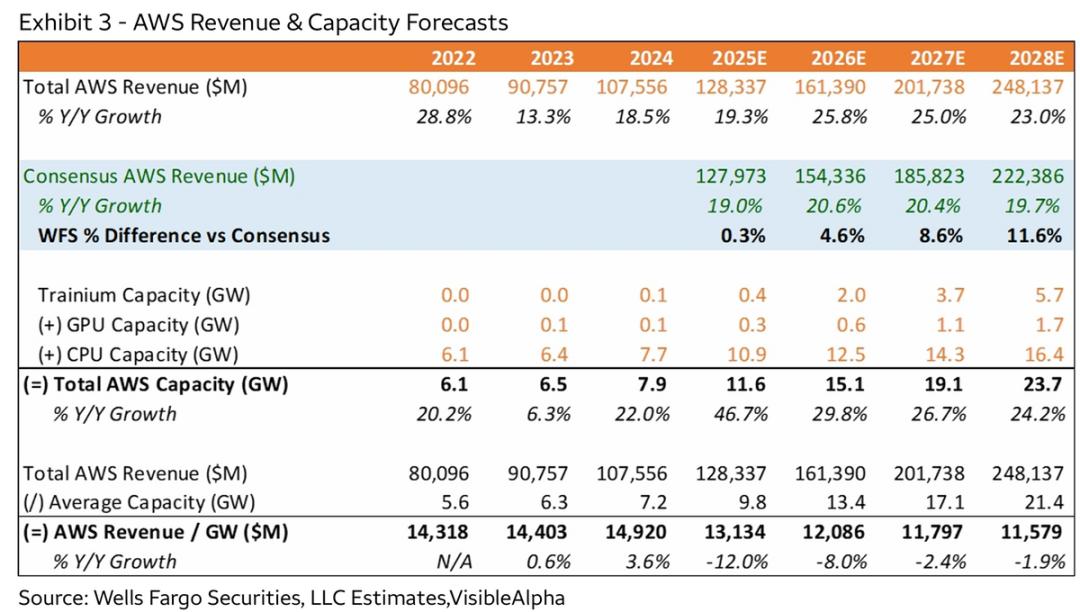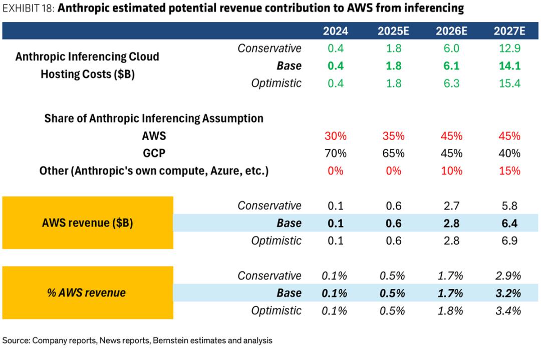 包括,a. Anthropic大量采用Trainium和Inferentia芯片用以模型训练和日常推理。亚马逊为其建设的Project Rainier预计总体量可达2.2GW,满产后有望给AWS带来年化约$140亿的收入;