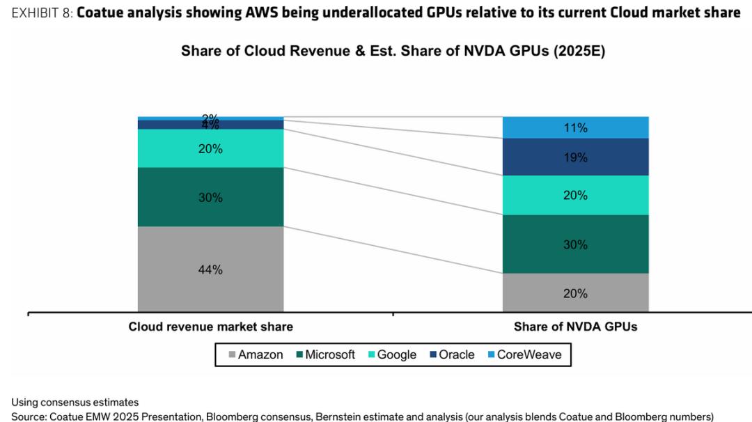 自研芯片对公司的最大意义,是有望加速解决亚马逊获得精尖英伟达芯片困难,导致算力爬坡持续受限的问题。此前Coatue的一个测算显示,AWS做为最大的云服务商(份额44%)却仅获得约20%的英伟达芯片,是头部云厂商中缺口最大的。
