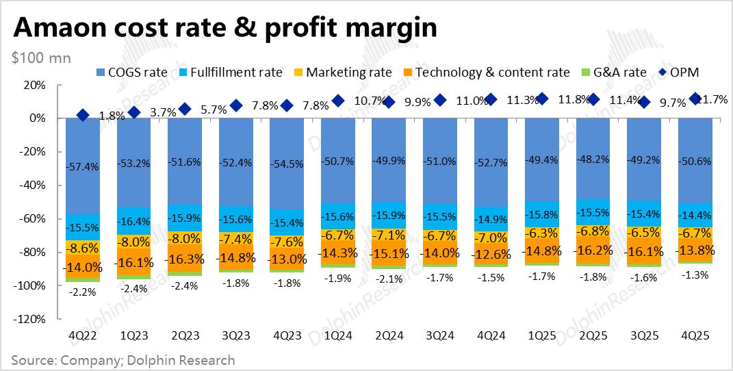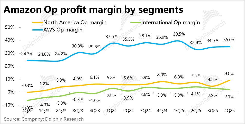 最关键的业务--AWS的增速也如期有近4pct的明显提速,虽市场已有充分的预期,实际表现也还是小幅beat。传统泛零售业务,虽不算亮眼,但至少增长稳健,利润率也在继续提升。因此,单看本季表现,确实并挑不出多少毛病。