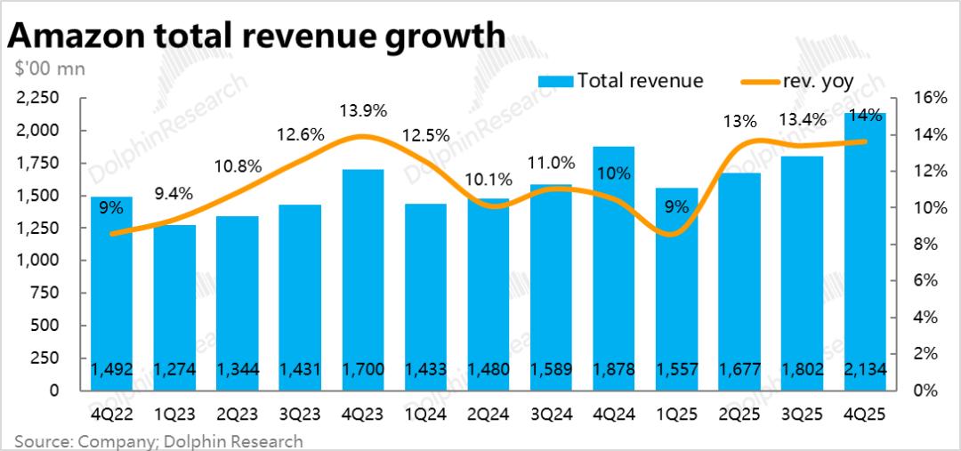 合计所有业务,亚马逊本季整体收入2134亿,同比增长13.6%,小幅加速并略高于市场预期。剔除汇率利好,则实际增速大体环比持平在12%。