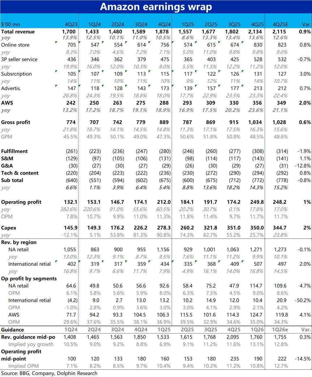 但也正因市场对AWS的提速已有充分预期,虽然彭博一致预期增速仅21%,实际买方预期增速接近23%。因此,虽然表现无疑不俗,但算不上预料之外的大beat。