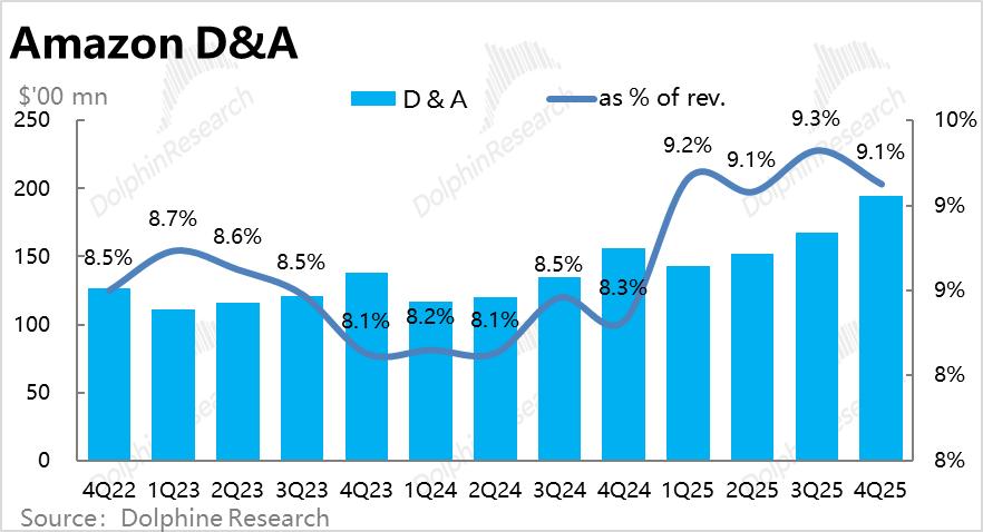 分板块看,AWS本季的经营利润率不降反增到35%,环比提升0.4pct。如前文提及,本季D&A占比实际是下降的,应当是原因之一。