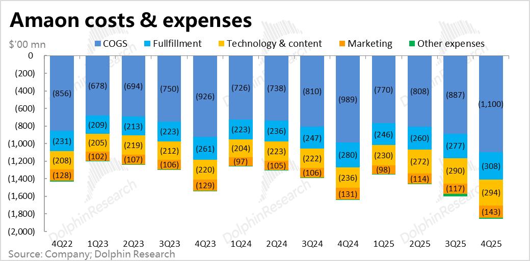 由于AWS的员工薪酬、研发成本、部分设备成本,以及流媒体内容的制作成本记在此费用项目中,可见这些业务上的投入力度较大。