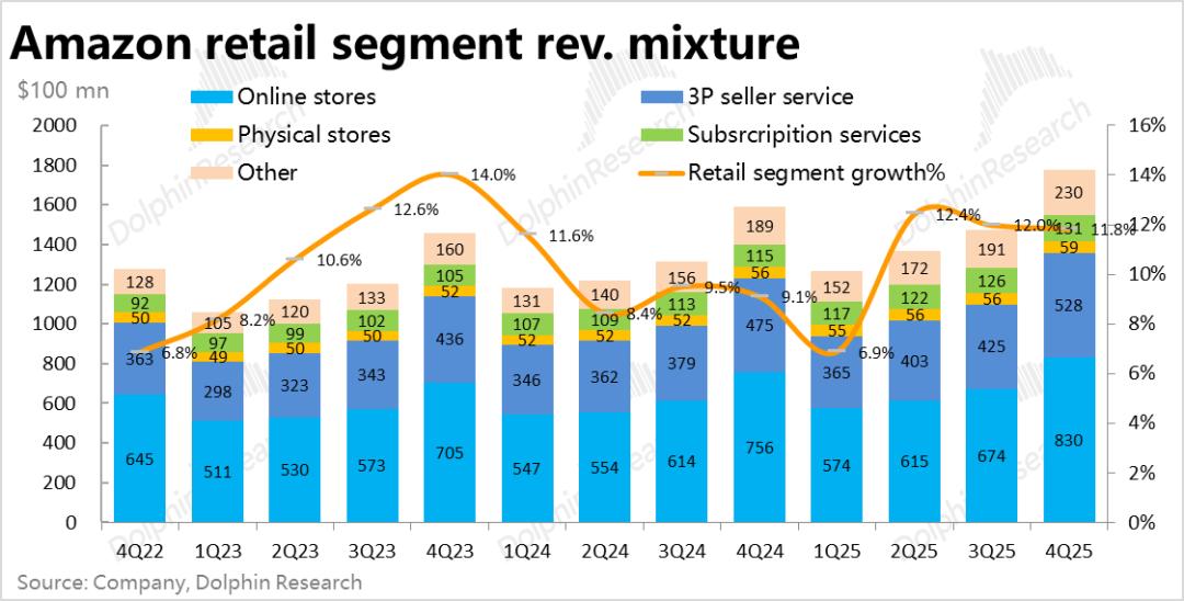 同样重要但当前不那么受关注的泛零售板块整体表现相对平稳。本季合计营收$1778亿,同比增长11.8%,增速较上季度稳中微降。