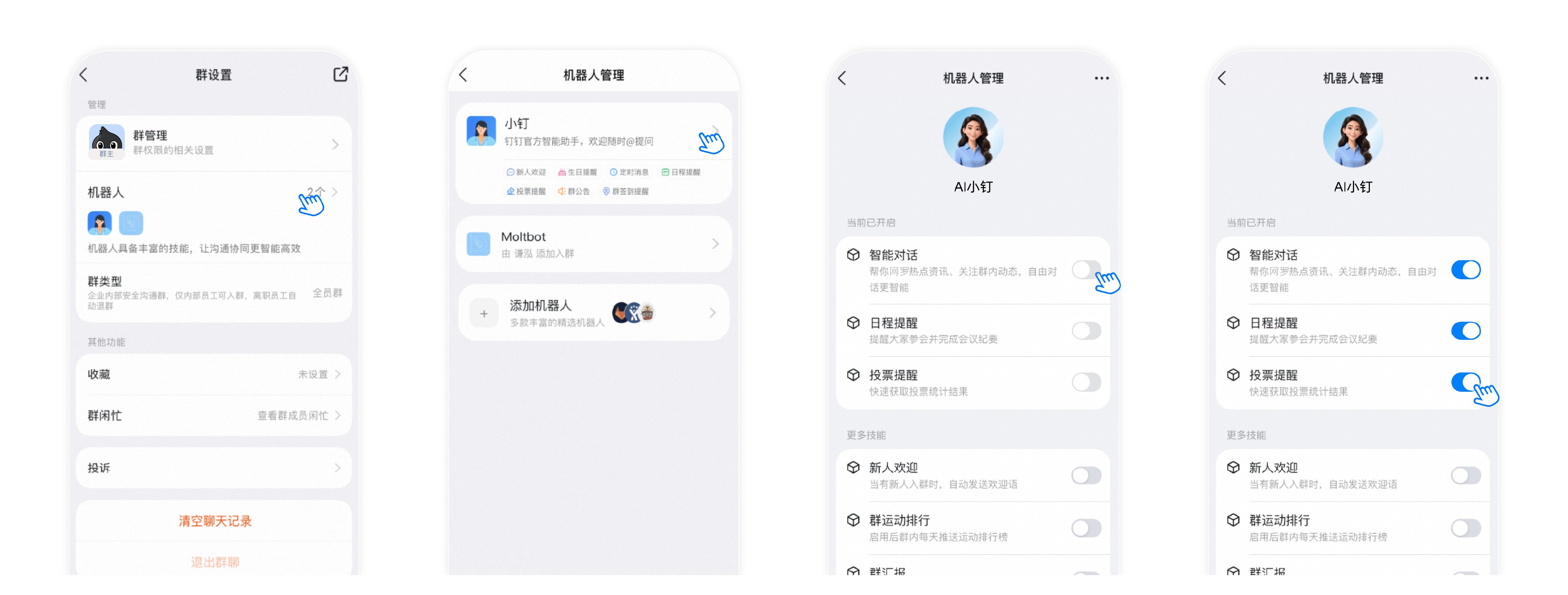 - 自然语言群管理:有了AI小钉,群管理员可告别繁琐操作,通过自然语言对话即可设置群快捷栏应用、调整群名称、批量设置群成员身份等。例如输入“@AI小钉,帮我把张三、李四、王五设置为项目经理”,一句话实现批量操作,再也不用一遍遍点击逐个设置。