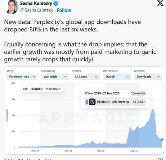 Perplexity曾被认为有机会颠覆谷歌搜索。它基于GPT等第三方模型,提供AI搜索体验。但随着谷歌、OpenAI纷纷推出自己的AI搜索功能,AI搜索应用的生存空间似乎在萎缩,2025年年底,Perplexity在六周内的下载量暴跌了80%。