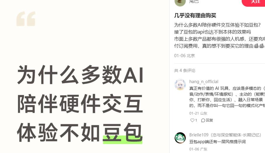 甚至有用户认为,交互能力上,豆包、GPT、DeepSeek这样的通用模型,在陪伴交互功能上好于专用的软硬件。