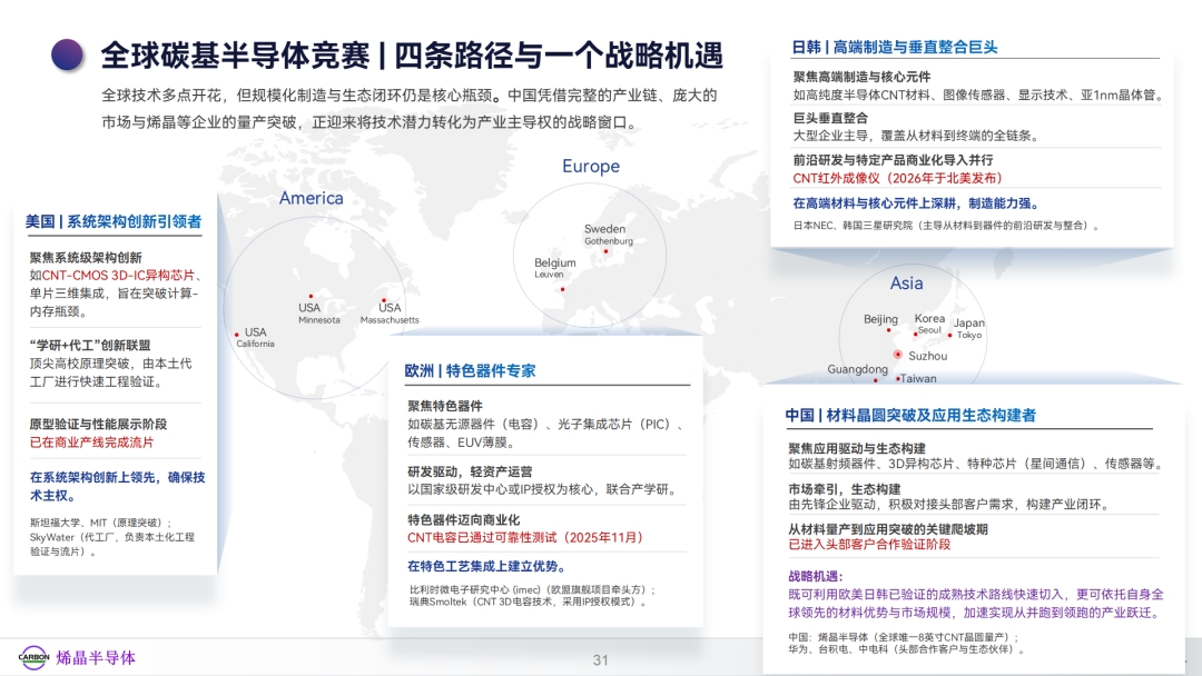 目前,全球产业化竞赛态势已十分明确:美国在CNT-CMOS 3D集成等系统架构上已实现流片验证;欧洲的碳基电容产品已通过可靠性认证,并加速商业化;日韩则在高端器制造与核心元件(如高性能红外传感器)上公布了具体发布计划。这些进展共同指向了先进算力芯片、特色分立器件和光电传感等即将爆发的市场方向。