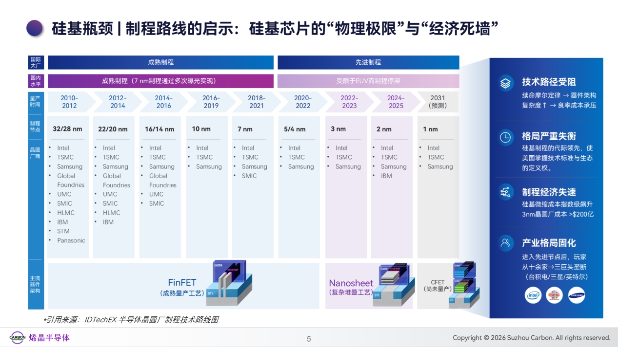 当下,硅基芯片技术正面临“物理极限”与“经济死墙”的双重挑战,制程微缩导致技术复杂度与成本急剧攀升。在此背景下,碳纳米管以其超高载流子迁移率、先进结构适配性及理想CMOS特性等优势,成为突破瓶颈的关键材料,有望以成熟制程实现先进节点的性能,开辟新的产业路径。