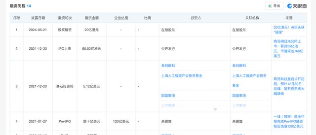 天眼查APP显示,不完全统计,如果算上IPO,那么商汤科技至少有过9轮融资。