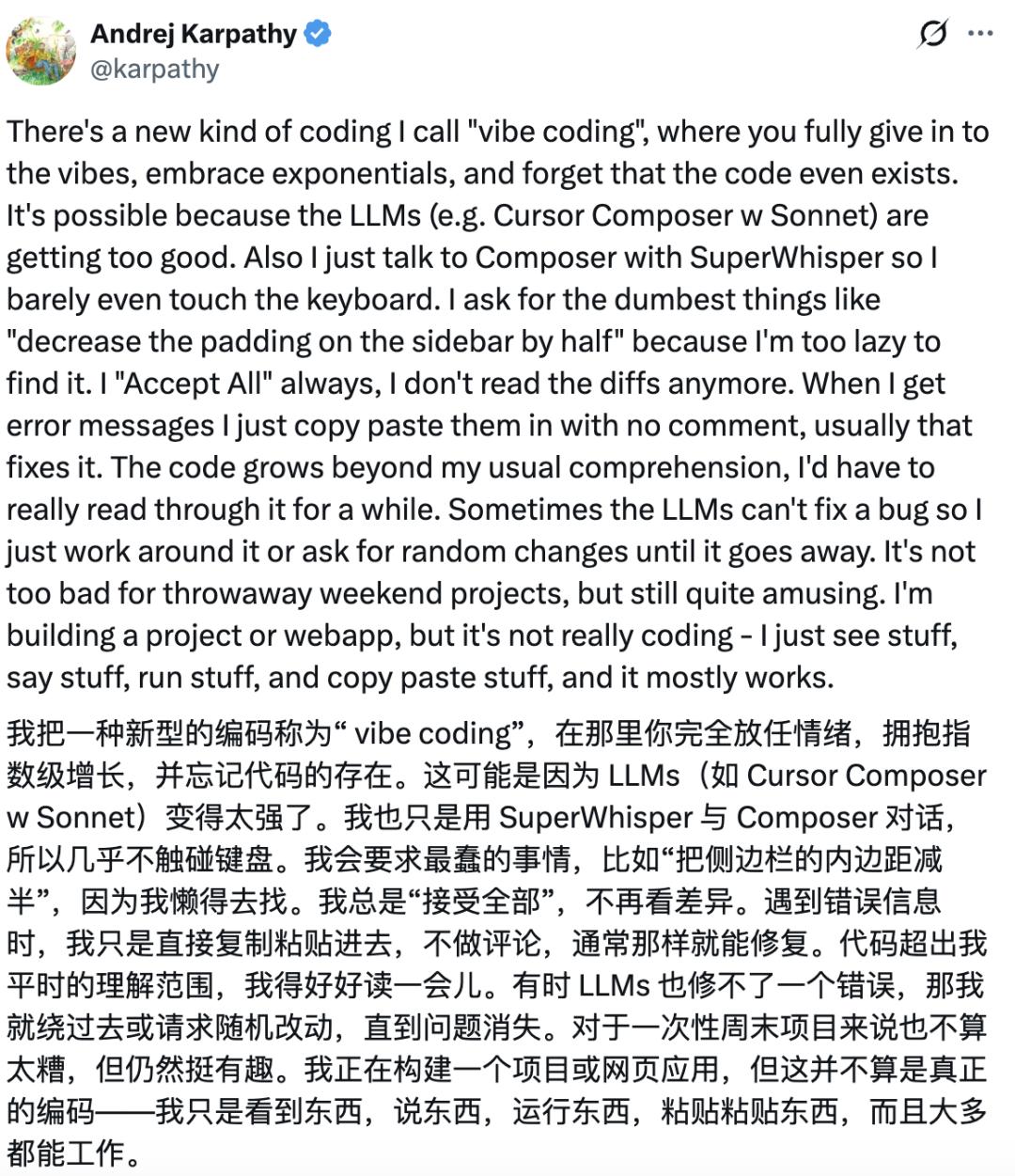 特斯拉前AI主管Andre Karpathy为这种邪门的操作取了个极具赛博感的名字:Vibe Coding。