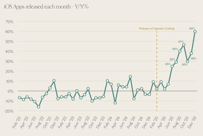 氛围编码正在走向主流。在近三年的持平增长之后,12月新应用上线同比跃升 60%。