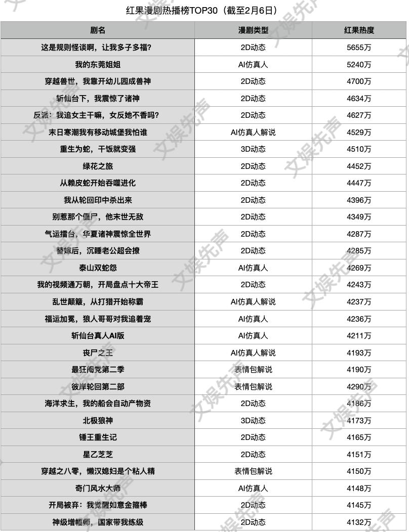 截至2月6日,红果漫剧热播榜显示,TOP30中共有8部为AI仿真人剧,TOP100中共计仅有25部为AI仿真人剧。包括《我的东莞姐姐》《末日寒潮我有移动堡垒我怕谁》等。从上榜作品类型上来看,“AI+仿真人”类漫剧基本上以AI仿真人演绎、AI旁白解说为主。其中,AI仿真人演绎漫剧题材相对泛化,而AI旁白解说仿真人漫剧类型中,末日、宅斗、逆袭题材则相对吃香。