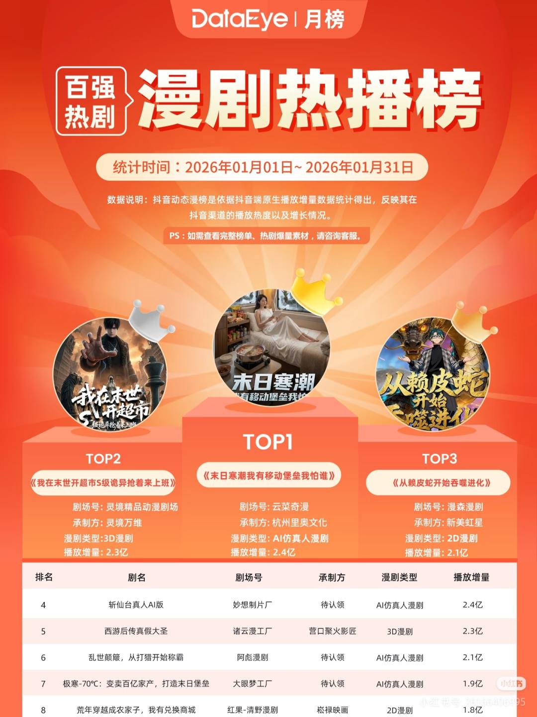 根据DateEye数据统计,2026年1月漫剧百强榜中,飙升最快的来自于AI仿真人剧,百强率从去年7%提升至38%,总计播放量达25.48亿。其中,《末日寒潮我有移动堡垒我怕谁》凭借2.3亿播放增量问鼎1月漫剧TOP1,在题材、类型上实现了漫剧市场的新突破;同时,突破10亿播放的AI 2D漫剧《斩仙台下,我震惊了诸神》的AI仿真人版《斩仙台真人AI版》上架不到一周,也达成播放量突破1亿。