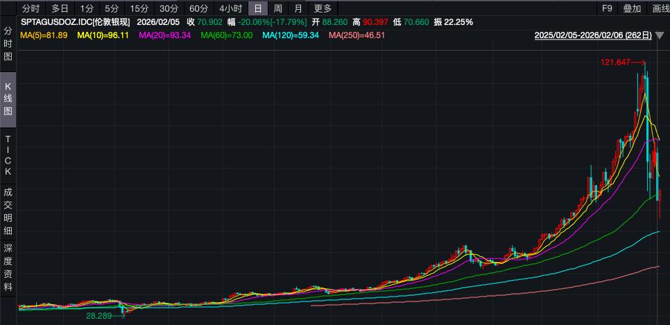 1月30日,现货白银价格巨幅回撤,全天累计下跌26.42%,收至85.26美元/盎司。此后,现货白银价格波动下调。2月6日,现货白银全天处于震荡状态,开盘时大幅走低,一度下跌9.69%,此后迅速收复跌势,由跌转涨,截至发稿时,上涨约2%,报约72.35美元/盎司。