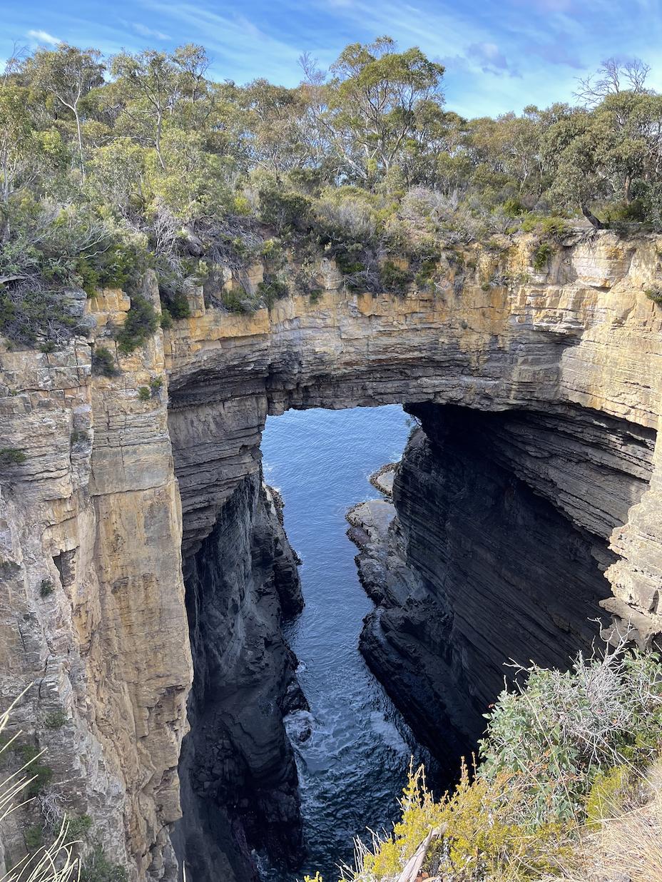 结束亚瑟港的行程,我们还在回程的路上参观了附近壮阔的自然景观 , 如 由 海水雕刻而成的棋盘道、壮观的喷水洞、巨大的塔斯曼拱门 …… 它们在成百上千年的沉淀里,形成了鬼斧神工的地貌特征 。