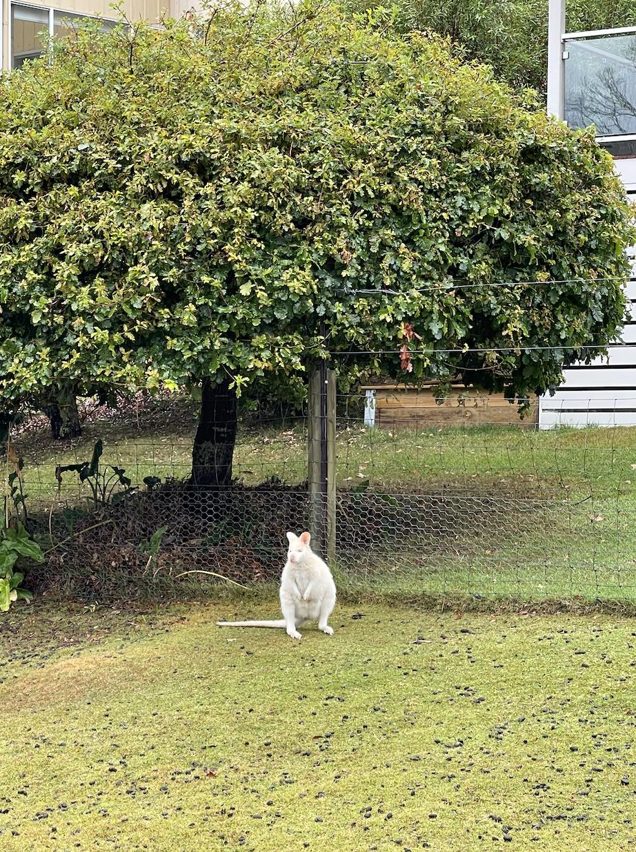 在布鲁尼岛另一处,我们找到了罕见的白袋鼠。白袋鼠体型不大,属于沙袋鼠(wallaby),白毛色源于基因突变的白化,但白色并不有利于袋鼠在野外隐藏自己。由于塔州缺乏原始大型捕食动物,白袋鼠们才在这里活了下来。