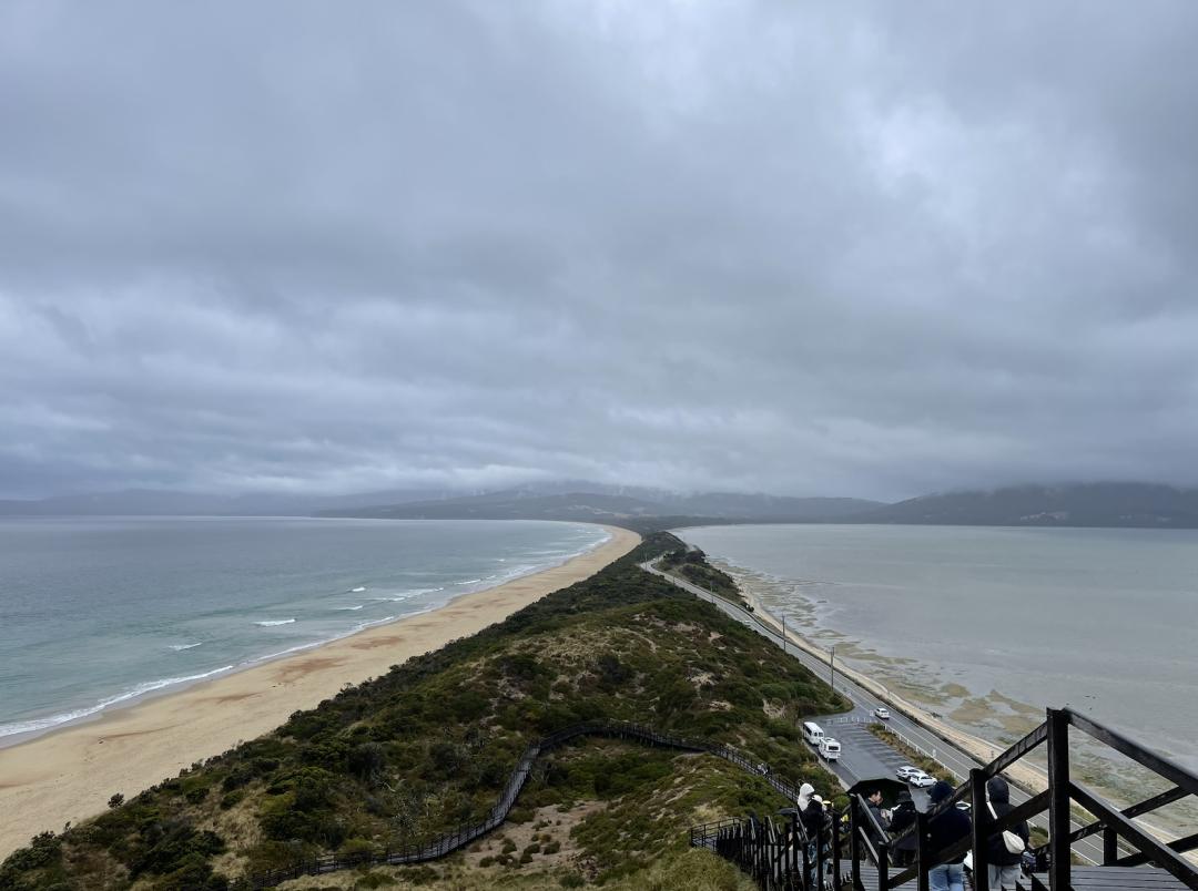 塔斯马尼亚的自然地貌是独一无二的。比如,我们有一天的行程是去东南角的布鲁尼岛(Bruny Island)。岛上最出名的自然景点叫“南北一线”(The Neck),顺着台阶往上走,可以在观景台俯瞰到一条浅浅的沙质地峡。