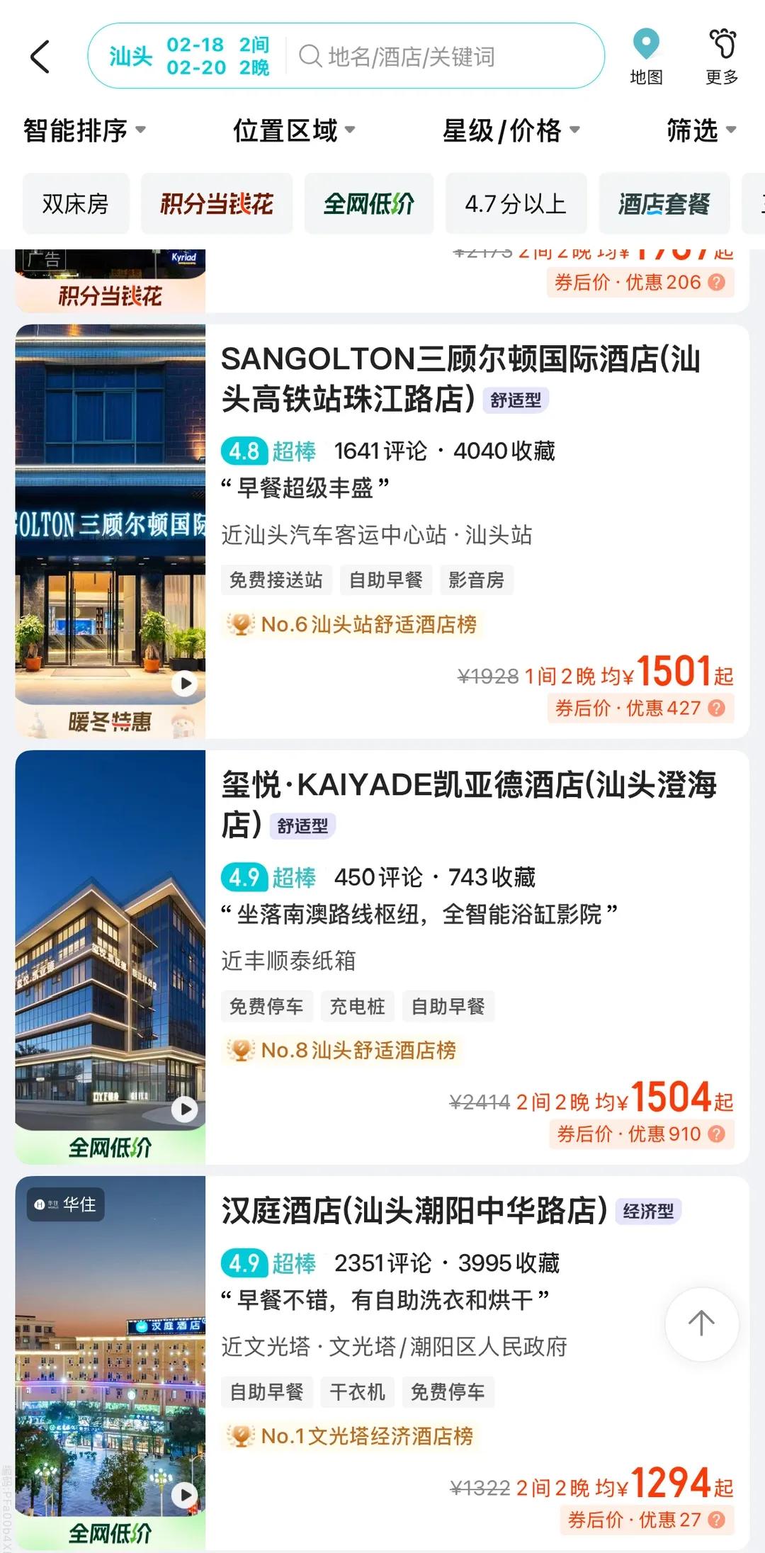 但在汕头、潮州这样的三四线城市,这类高品质连锁酒店的数量是极其有限的。一个城市可能就那么几家,分布在核心商圈或景区附近。