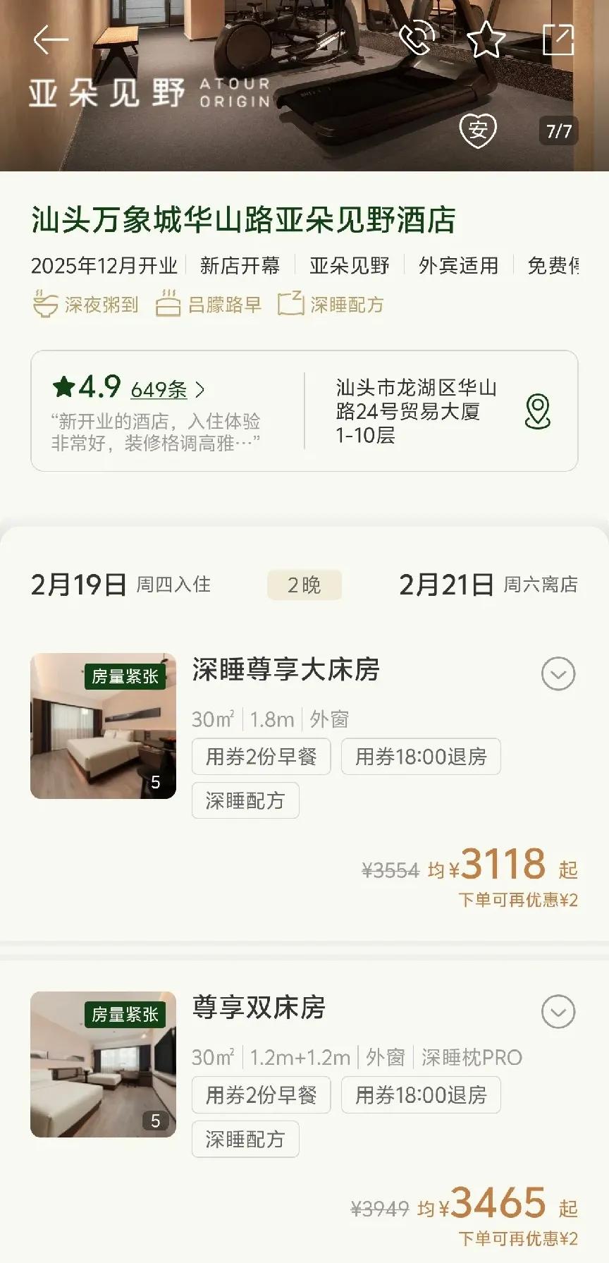 亚朵老用户张雅欣晒出截图,汕头万象城华山路那家亚朵,最低规格的大床房也超过了3000元一晚,城里其他的亚朵价格也在持续上涨。
