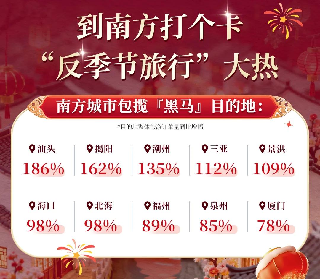 同程旅行发布的《2026年春节旅行趋势报告》也显示,截至1月27日,广东省春节假期酒店预订热度同比激增169%。其中,清远、揭阳和汕头表现尤为亮眼,预订量分别飙升342%、337%和212%。