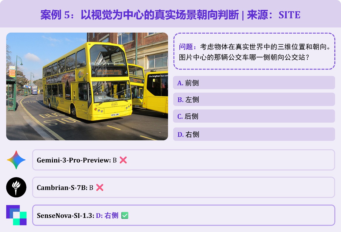 以双层巴士与公交站的场景为题,需避免陷入“英国巴士靠左行驶,因此靠站的是左侧”的常识陷阱,而是通过实际的视觉画面判断方位。 根据示例图,SenseNova-SI-1.3 准确理解 “右侧” 为正确答案。