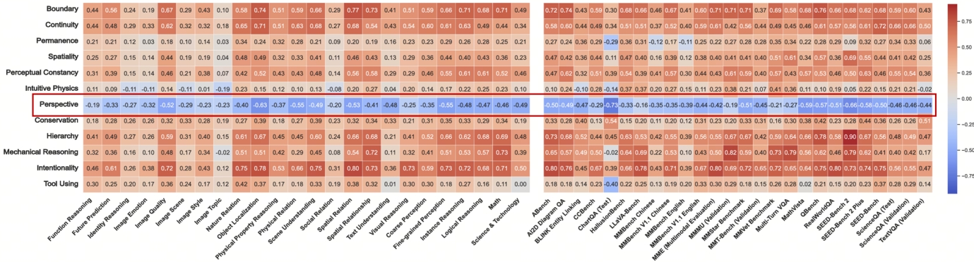 Core Knowledge Deficits in Multi-Modal Language Models (2025)发现视角转换任务与其它多模态任务的相关性(红框内)呈蓝色,即代表相关性较低