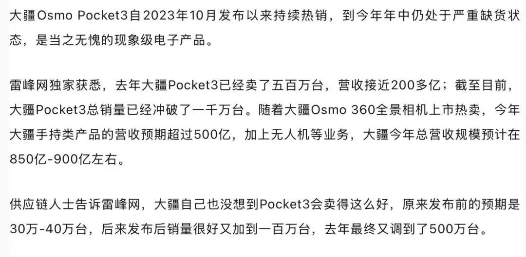 截至 2025 年 9 月,Osmo Pocket 3 总销量突破一千万台,达到这个夸张的数字,Pocket 3 只用了两年。