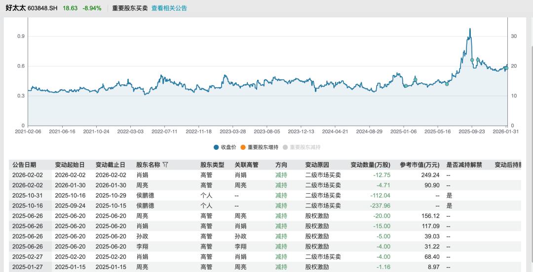 2026年1月6日,好太太披露总经理周亮、副总经理肖娟的减持计划。2月3日,二人减持完毕,分别套现约90.9万元、249.24万元,合计套现约340.14万元。