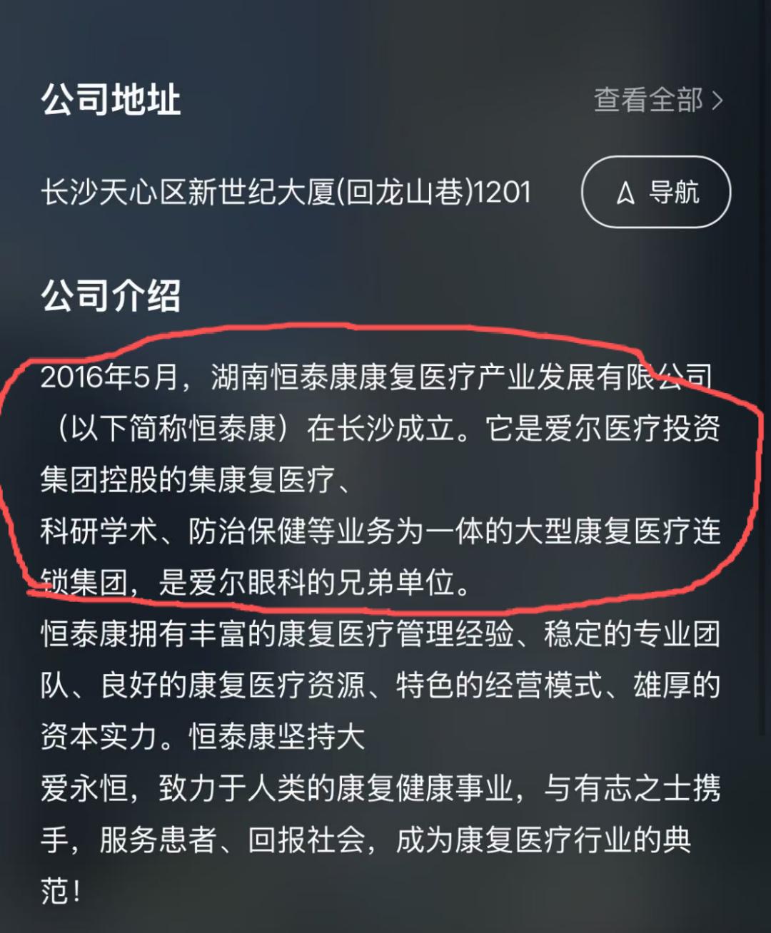 更耐人寻味的是,凤凰网《风暴眼》发现,湖南恒泰康的董事长张跃文,同时身兼爱尔眼科党委书记、爱尔医疗投资集团总裁数职;而湖南恒泰康在相关平台的简介中,直接将爱尔眼科称作“兄弟单位”。