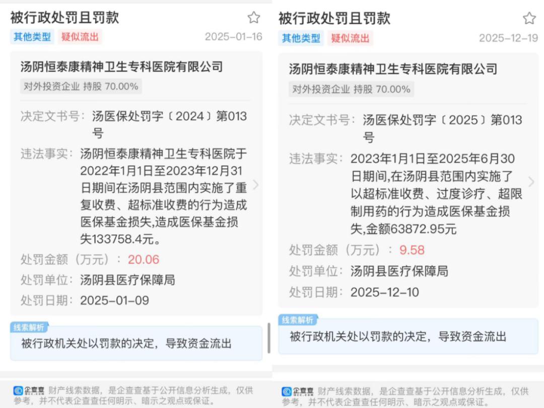 位于河南的由恒泰康控股70%的“汤阴恒泰康精神卫生专科医院”,2023年1月1日至2025年6月30日期间,因实施了以超标准收费、过度诊疗、超限制用药的行为造成医保基金损失,金额6.39万元。汤阴县医疗保障局在2025年12月10日对其行政处罚且罚款9.58万元。