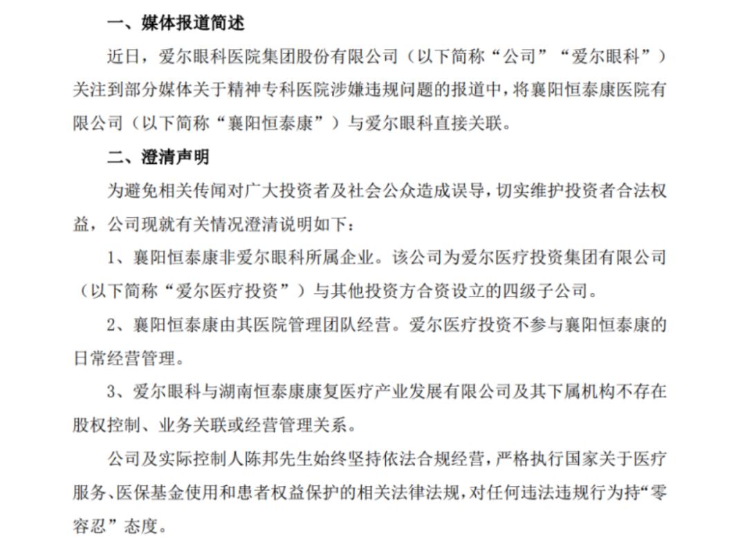 同时,爱尔眼科还强调,自身与湖南恒泰康康复医疗产业发展有限公司及其下属所有机构,不存在任何股权控制、业务合作或经营管理上的关联。