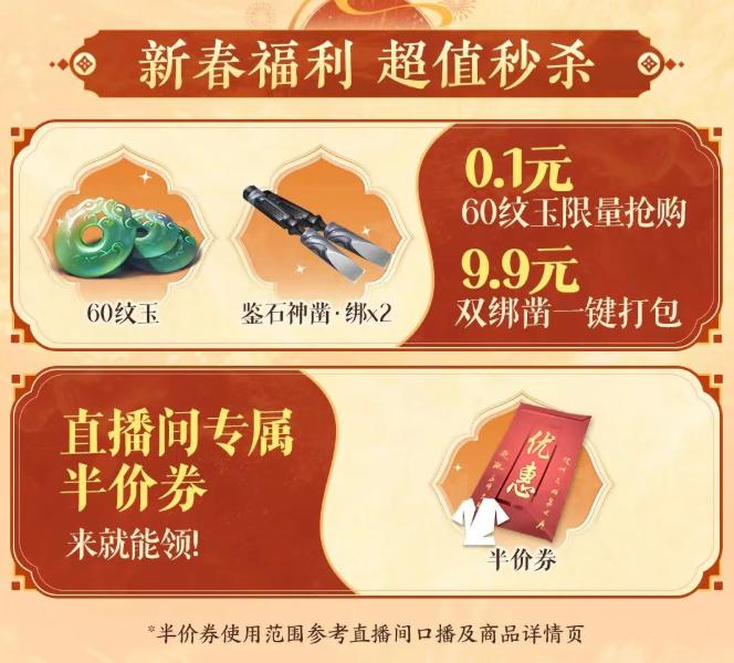 《逆水寒》手游今年春节的“大宋年货节”直播,就包括专属半价券、1毛钱秒杀活动、限时外观返场等一众福利与活动。