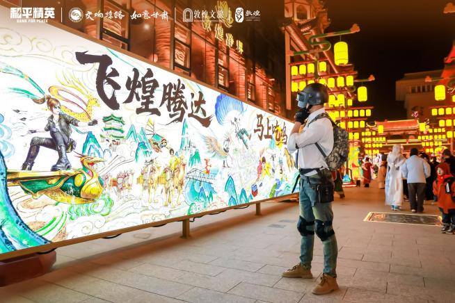 今年1月27日,《和平精英》“丝路贺新春”新春版本正式发布,游戏携手甘肃省文化和旅游厅、敦煌文旅开展了文旅联动:鸣沙山月牙泉风景区有《和平精英》限定大吉骆驼,敦煌夜市核心区域赫然是《和平精英》光子鸡飞天创意花灯展位,敦煌壁画大师、敦煌国际美术馆馆长张杰龙还创作了十米巨幅实体《敦煌吃鸡图》,在敦煌夜市展出。