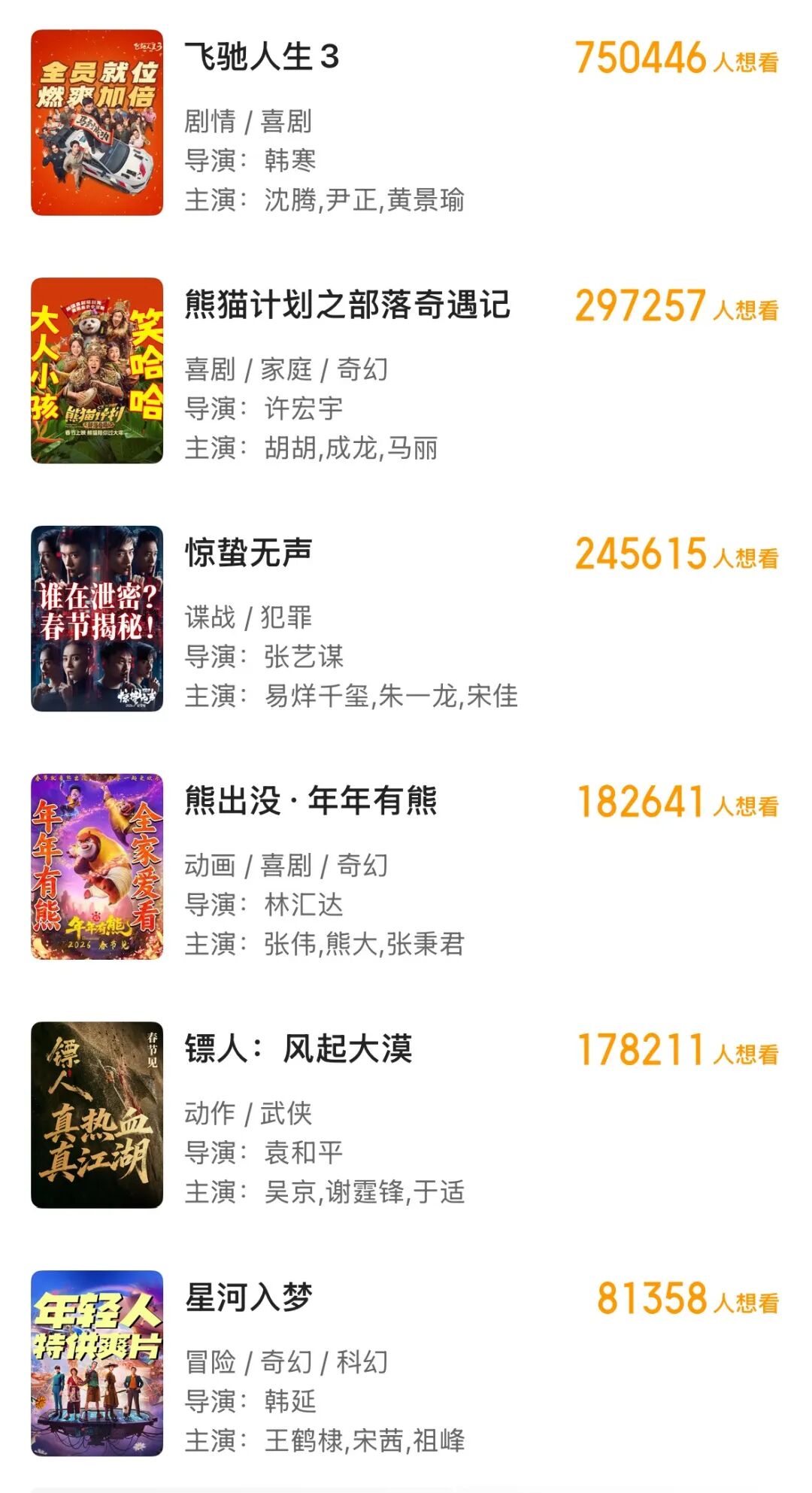 从想看人数最高的《飞驰人生3》(沈腾、尹正、黄景瑜等主演),到吴京、谢霆锋领衔的武侠片《镖人:风起大漠》,再到张艺谋聚焦国安题材的双男主戏《惊蛰无声》(易烊千玺、朱一龙主演),乃至合家欢导向的《熊猫计划之部落奇遇记》——几部主流真人电影,几乎清一色由男性角色挑梁。