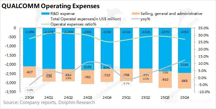 高通在2026财年第一季度(即25Q4)的经营费用为33.2亿美元,同比增长12.4%。