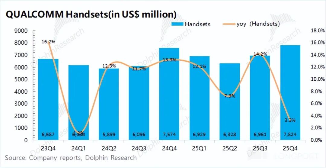 高通的手机业务在2026财年第一季度(即25Q4)实现营收78.2亿美元,同比增长3.3%,符合预期(77.5亿美元)。