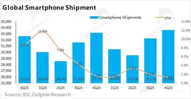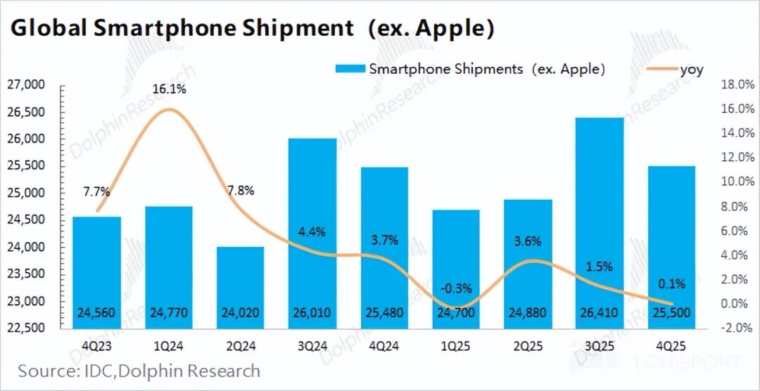 结合行业数据看,在叠加苹果新机“加量不加价”策略的影响下,2025年第四季度除苹果之外的智能手机出货量为2.55亿台,同比基本持平,表明安卓类市场是相当低迷的。