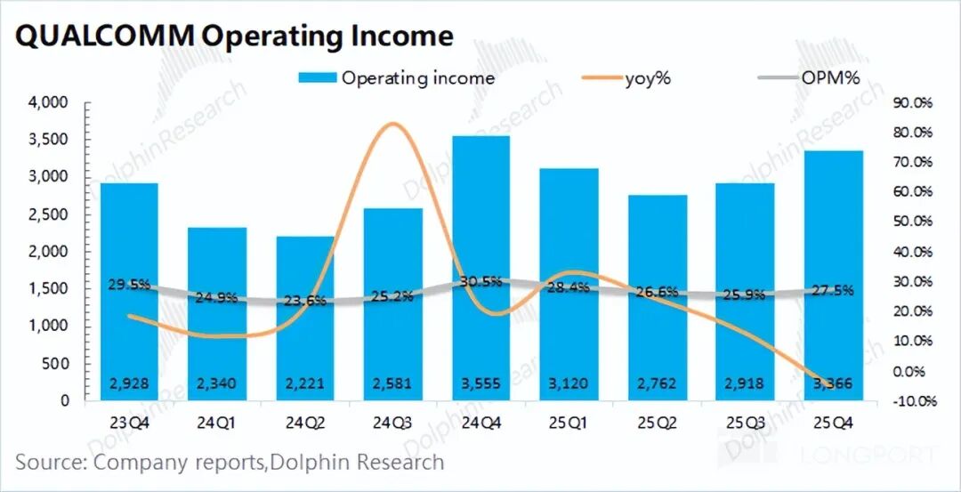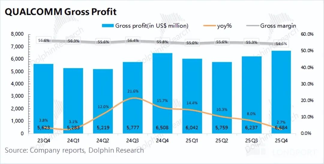 高通在2026财年第一季度(即25Q4)实现毛利66.8亿美元,同比增长2.7%。