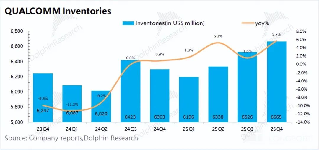 高通在2026财年第一季度(即25Q4)的存货有66.7亿美元,同比增长6%。