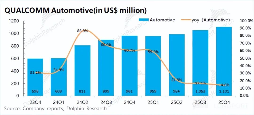 高通的汽车业务在2026财年第一季度(即25Q4)实现营收11亿美元,同比增长14.6%,符合市场预期(10.8亿美元),主要是受Snapdragon数字底盘出货增加的带动。