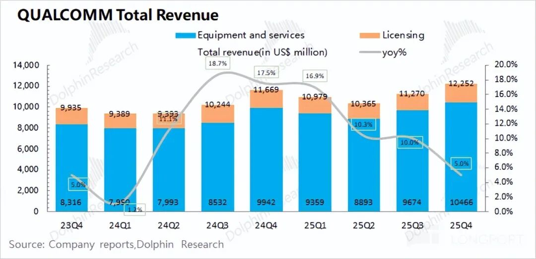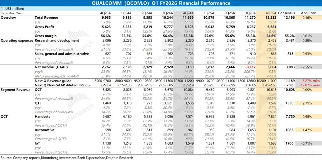 高通在2026财年第一季度(即25Q4)实现营收122.5亿美元,同比增长5%,符合市场预期(122亿美元)。