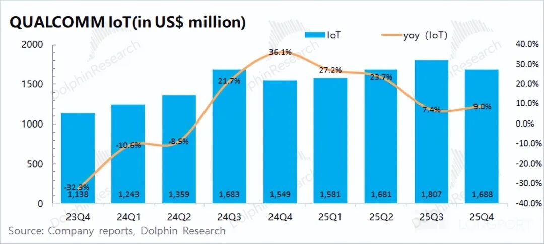 高通的IoT业务在2026财年第一季度(即25Q4)实现营收16.9亿美元,同比增长9%,符合市场预期(17亿美元)。在经历此前两位数增长后,IoT业务增速已经回落至个位数。