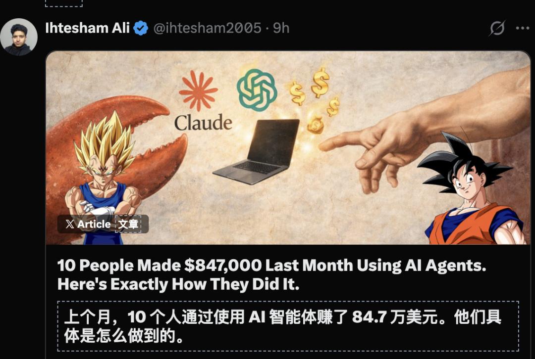 他统计到:一个月里,10个人用智能体赚了84.7万美元。